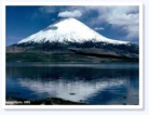 Boliviens, der blaue Himmel und das Wasser des Lago Chungará, in dem sich die ganze Szenerie spiegelt.