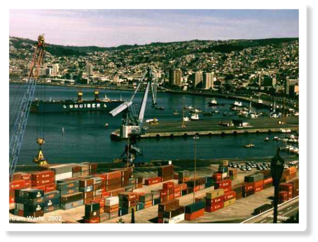 Bucht mit Concón, Viña del Mar und Valparaíso mit dessen Hafen. Wie auf dem