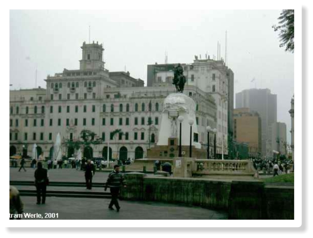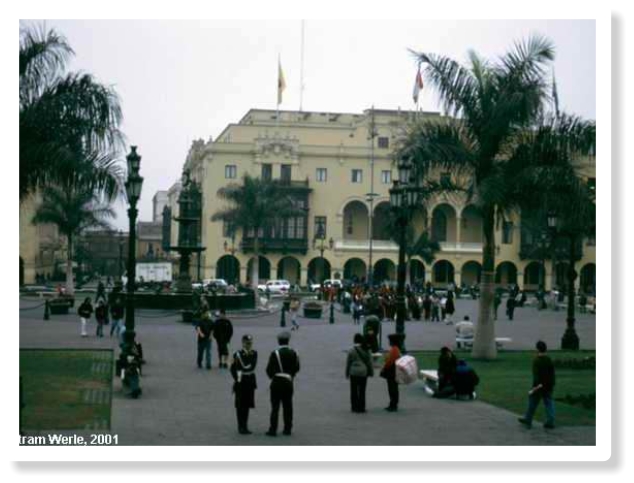 ein Denkmal Pizarros, auf dessen Haupt gerade eine Taube ihre Exkremente hinterließ. In der Mitte der Plaza steht ein Brunnen aus