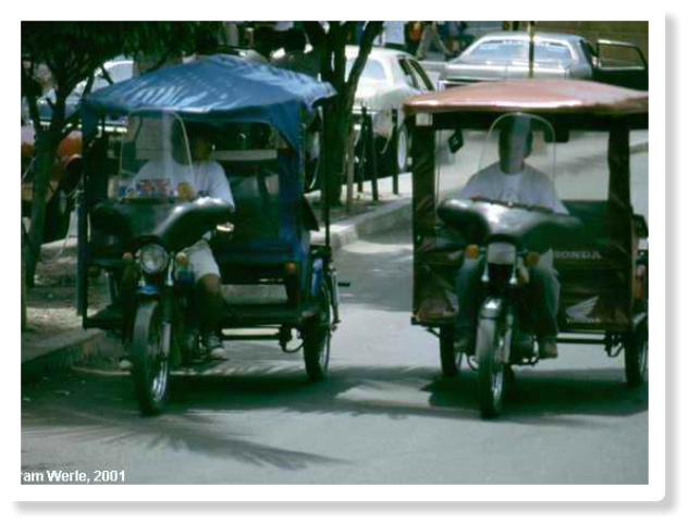 umgebaute Motorräder, die aussahen wie Rikschas. Ein Hinweisschild verriet: bis Lima sind es von hier aus