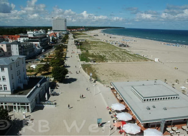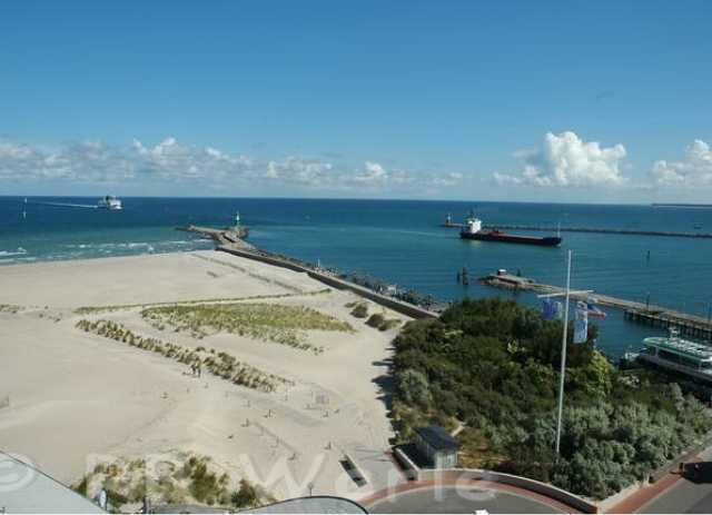 super Rundblick über Strandpromenade, die Hafeneinfahrt mit der Mole bis hin zum Überseehafen von Rostock am Horizont. Mit der